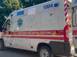 Esposta un’ambulanza mitragliata dall’esercito russo durante la guerra in Ucraina